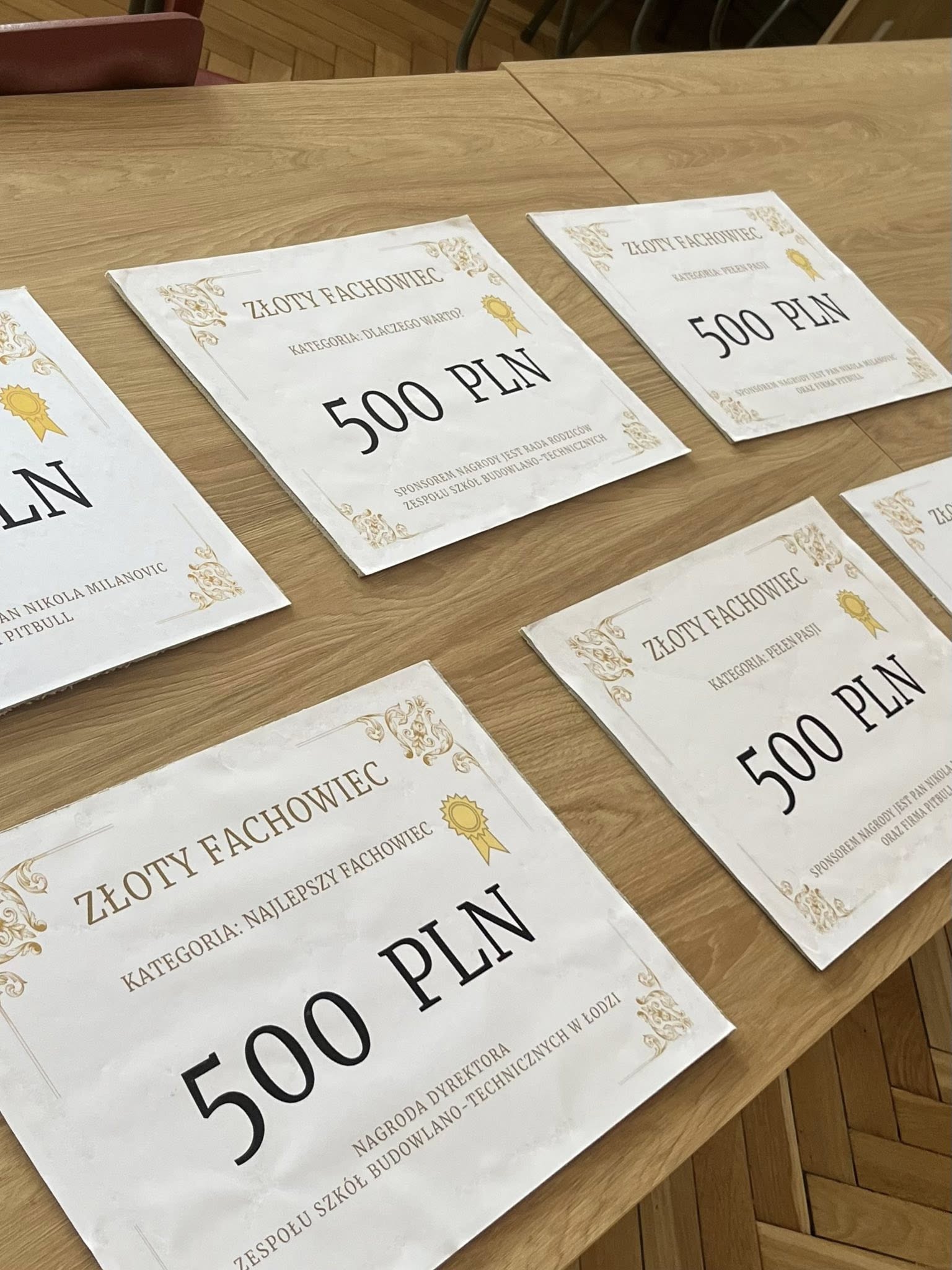 Na szczególne podkreślenie zasługuje wsparcie sponsorów. Fundatorami nagród były Panie Dyrektor: Elżbieta Kuskowska oraz Barbara Gałwa, Rada Rodziców, a także pan Nikola Milanovic – mistrz Polski w judo, firma PSB Profi Sanbud, firma DeWalt, firma Ultrament oraz osoby prywatne. Dzięki ich zaangażowaniu udało się zgromadzić wartościowe nagrody – zarówno w formie pieniężnej, jak i profesjonalnego sprzętu budowlanego, który z pewnością posłuży uczniom w dalszym rozwoju zawodowym.